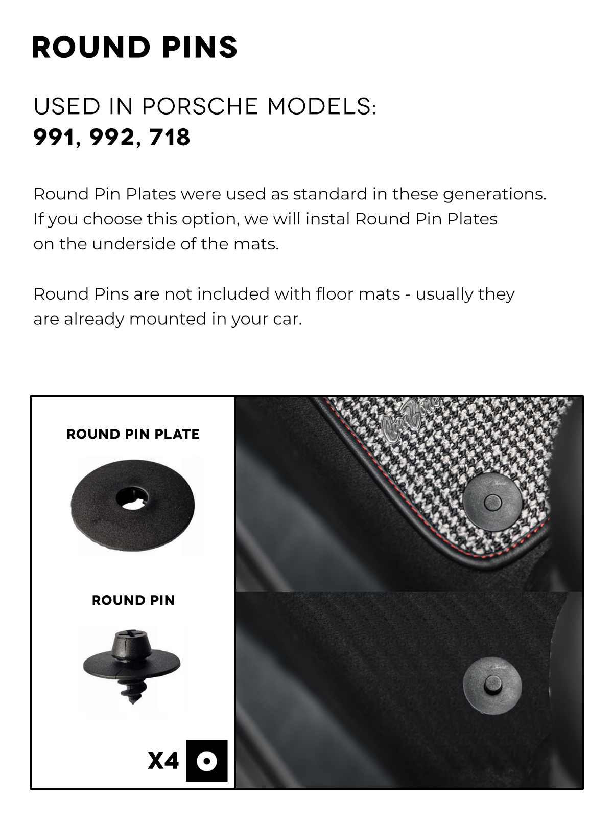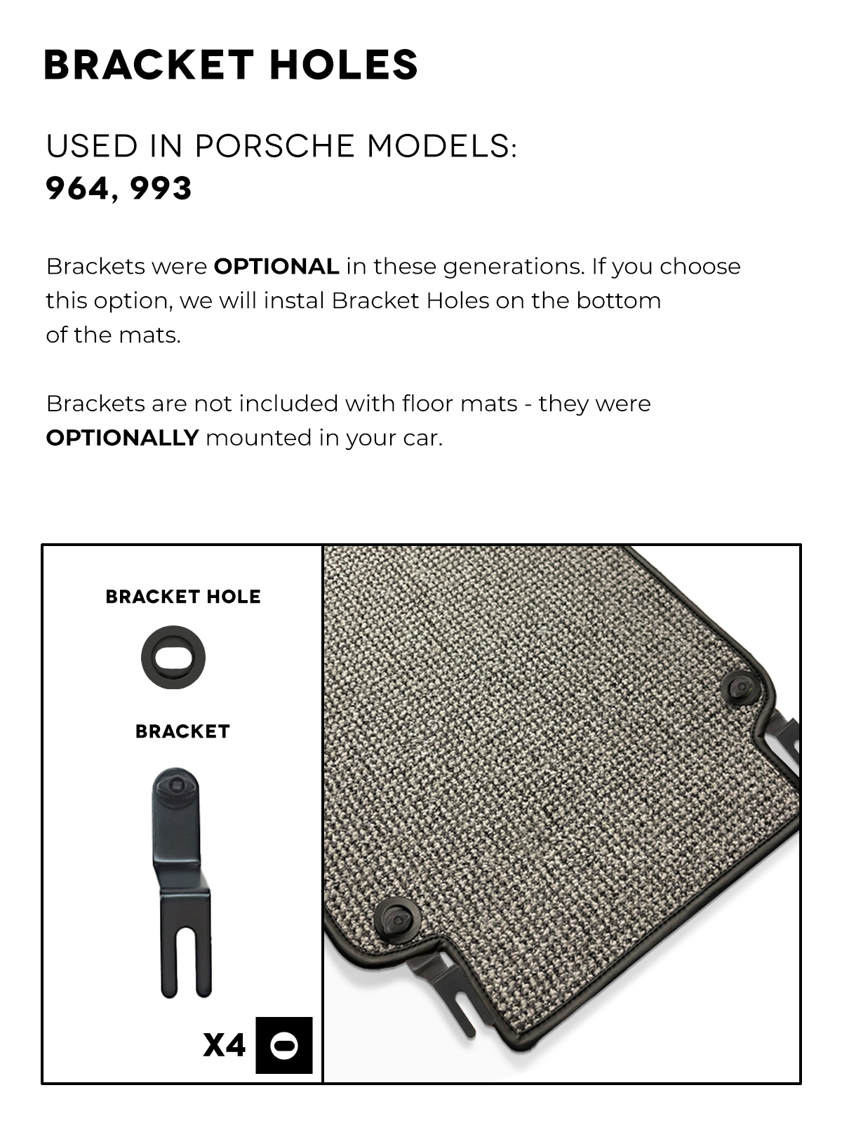 CarBone floor mats come without specific mounting points as a standard. If you wish to have installed any of the retention holders/clips/clamps please let us know in the order notes.