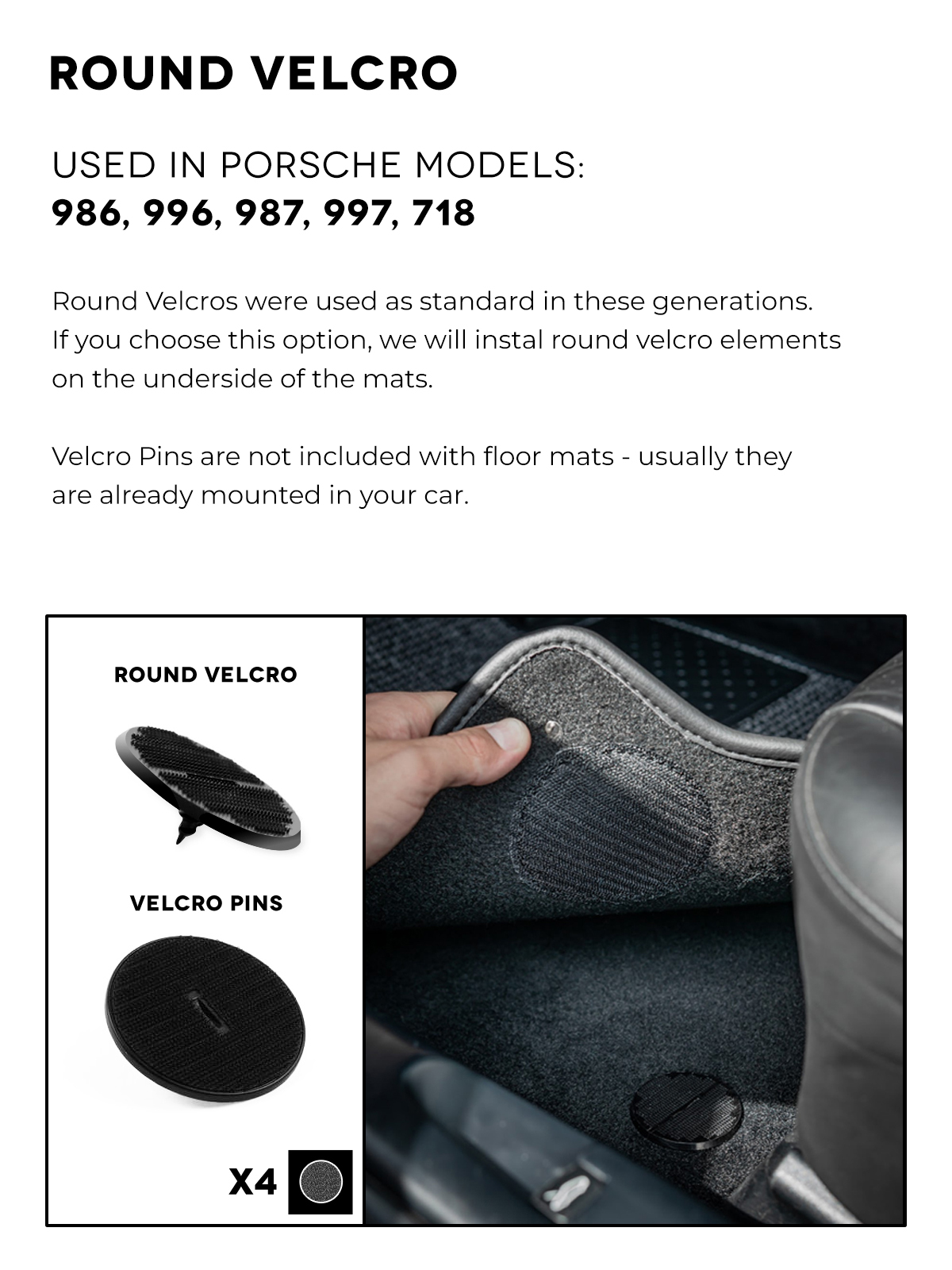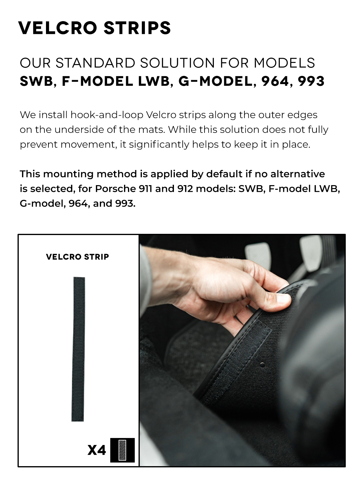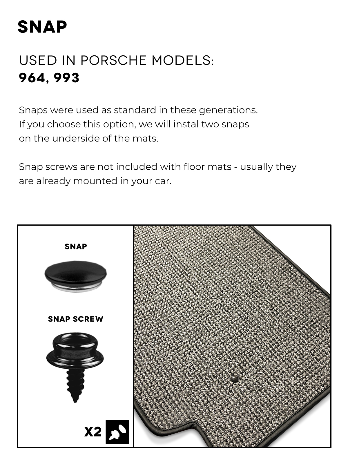 For cars like 964, F, G models we offer a perfect set that consists of 4 floor mats (2 front, 2 rear) and the trunk mat, all made of the same material. The sets are available as separate products. See link below: